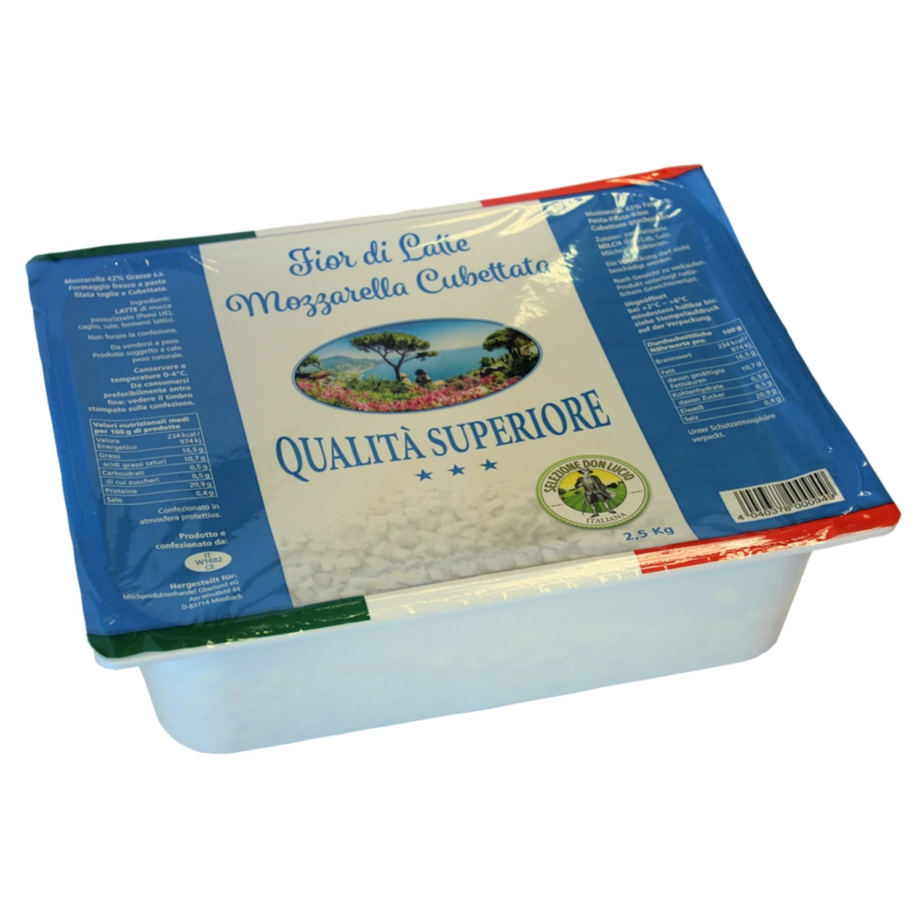 Mozzarella Cubettata wird in gleichmäßige Würfel geschnitten und ist besonders praktisch für Salate, Aufläufe und kalte Anwendungen. Die Würfelform sorgt für eine gleichmäßige Verteilung und ansprechende Optik.